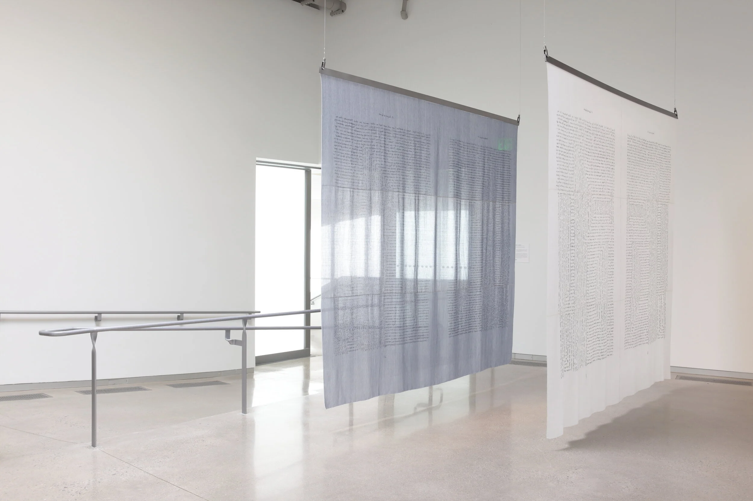 Visitors are invited to carefully walk through the corridor formed by To the Various Futures (Not to All), two hand-woven panels, produced by Donnelly through a painstaking process. In the first stage, her weavings contain legible text taken from Jorge Luis Borges’s 1941 short story ‘The Garden of Forking Paths,’ in which notions of overlapping time, fate, and decision-making form labyrinthine narratives. Then by unraveling and reweaving each panel, Donnelly creates a hazy, maze-like script. Through these material processes, the loom and the hand become extensions of Borges’s serpentine narrative.